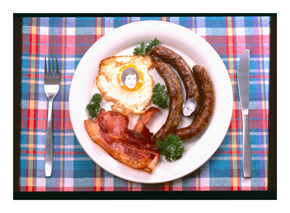 The first piece of work that started with this theme,“Dining In”, was created in the studio on Fuji Velvia transparency film. I have now titled it “Egg and Bacon Pie” in reference to the picnic meal we used to eat every Easter holiday when we went for a long drive as a family.